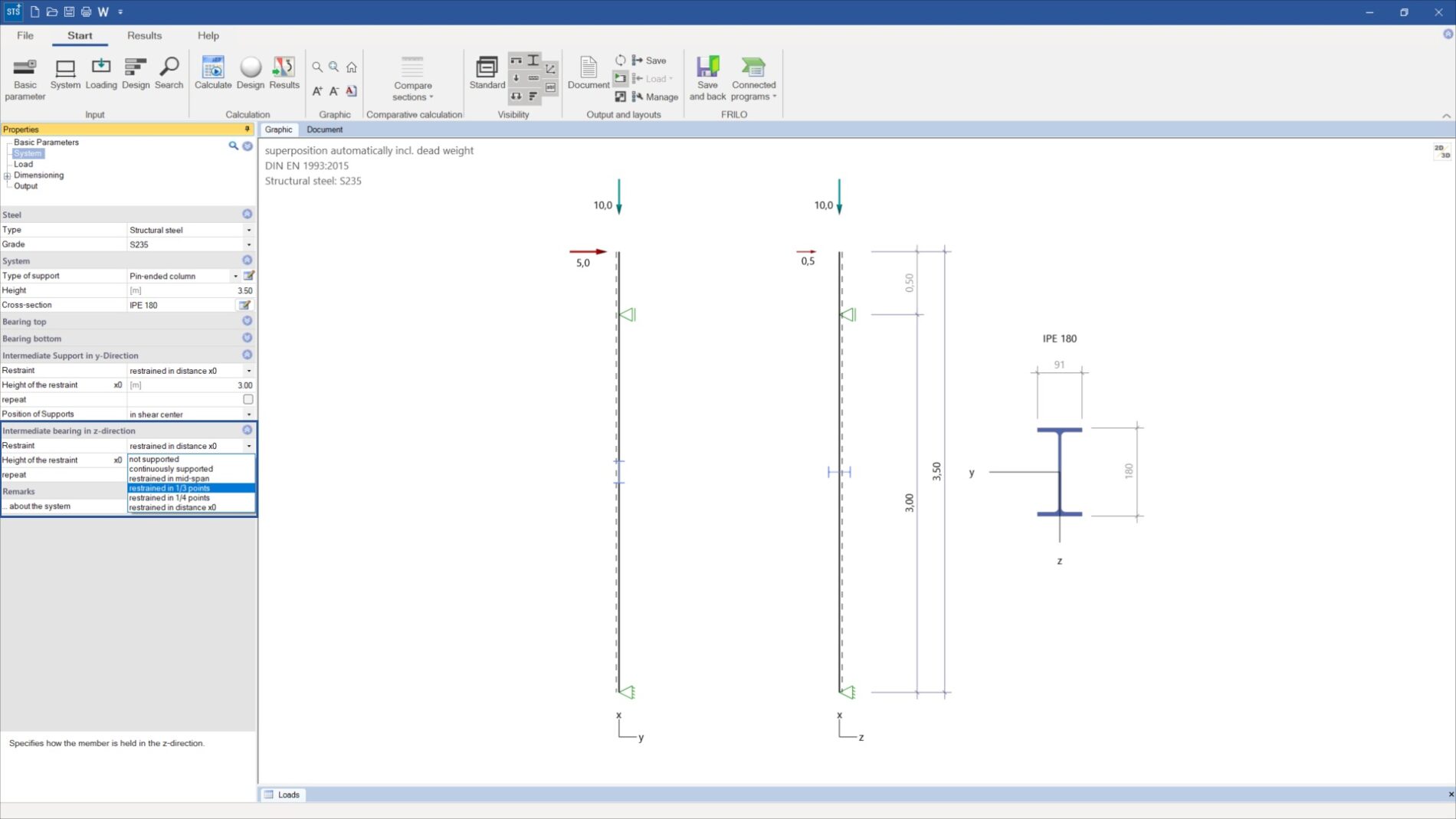 Until now, users of the Single-span Steel Column program STS+ could only define intermediate supports in the y-direction (in the direction of the weak axis). With the updated FRILO 2024-2 version, they can also enter intermediate supports in the z-direction (in the direction of the strong axis). The following types of intermediate supports are available for selection: continuously supported, restrained in mid-span, restrained in third points, restrained in quarter points, restrained at distance x0. The extension allows users to fully map the entire structural system now.