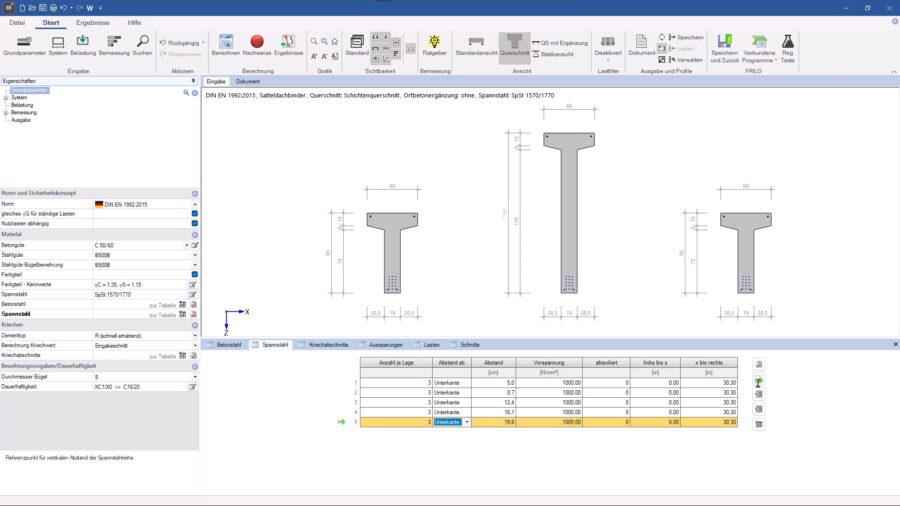 With the new “Prestressed Reinforced Concrete Girder” PLUS program reinforced concrete beams and pre-tensioned girders can be analyzed and designed. The new modern, interactive “PLUS” enhances the look and feel of the application by enabling quick and easy system input and editing. For prestressed beams, all required ULS (ultimate limit state) and SLS (serviceability limit state) verifications can be performed, taking into account time-dependent losses due to creep, shrinkage, and relaxation. Key features include the consideration of cast-in-place concrete additions, heat treatment, and load-bearing strengthening. The modeling of Double-T seczions can be parameterized, and compatibility with other “PLUS” programs is provided.