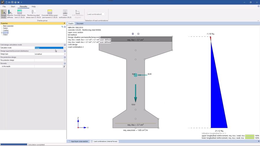 The “Verification of Reinforced Concrete Cross-Sections” program now includes the national annexes of EN 1992 for the Czech Republic, France, the Netherlands, and Belgium. This allows not only cross-section design for bending with axial force, shear, and torsion, but also verification of crack widths and stresses. In addition, the effective stiffness can be determined. The program also makes it possible to analyze cross-sections with cast-in-place concrete additions and to perform fire design for rectangular and circular cross-sections using the general method based on a thermal FEM analysis. A new feature is an additional verification mode that allows checking the load-bearing capacity of a cross-section with predefined reinforcement.