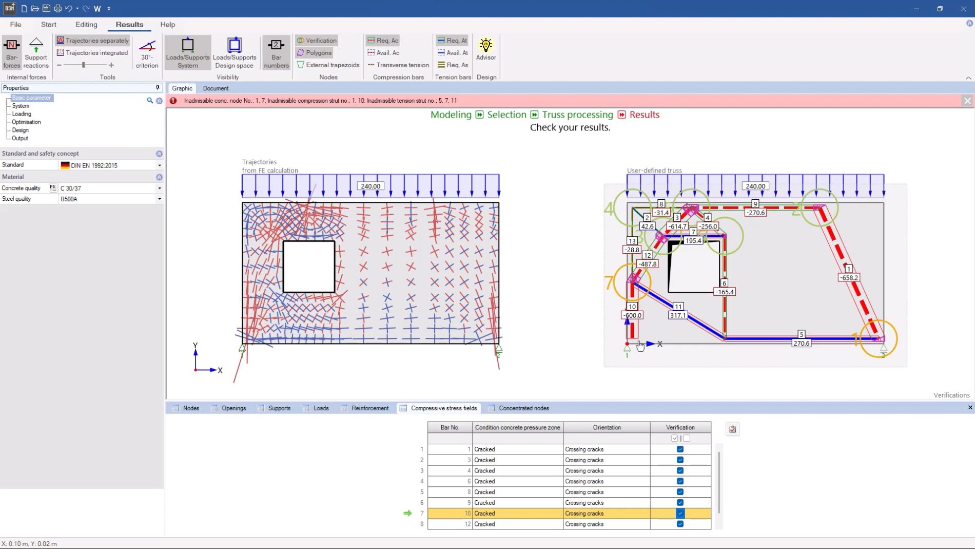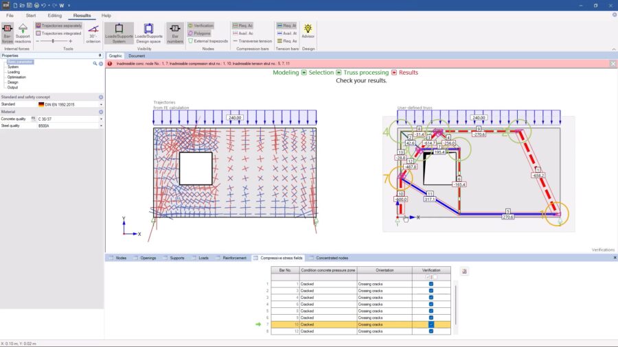 Until now, the “Strut-and-Tie Model Reinforced Concrete” program only generated strut-and-tie models for the design of reinforced concrete components without actually performing the design of it. With the FRILO 2026 version, it is now also possible to perform the analysis and design of stiffness-optimized and user-defined strut-and-tie models. The verification of compression struts, the verification of tension struts with reinforcement selection, the verification of compression at load bearing supports and under load plates, the transverse tension verification, and the verification of nodes can be performed. Users are supported with tips and guidance throughout the process.