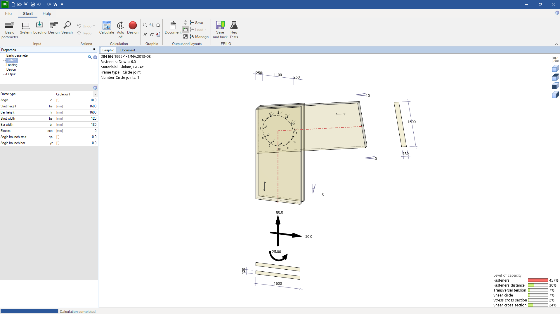 The verifications of the dowel circles are based on the explanations given by C. Scheer and K. Andresen in the publication Ingenieurholzbau (Timber engineering). The loading of the dowels produced by shear force and axial force is assumed to be evenly distributed over all dowels. If the dowels are arranged in two circles as specified by B. Heimeshoff: Berechnung Rahmenecken mit Dübelanschluss (Calculation of frame corners with dowel connection), the permissible dowel loading may be reduced by 15 % for all dowels.
