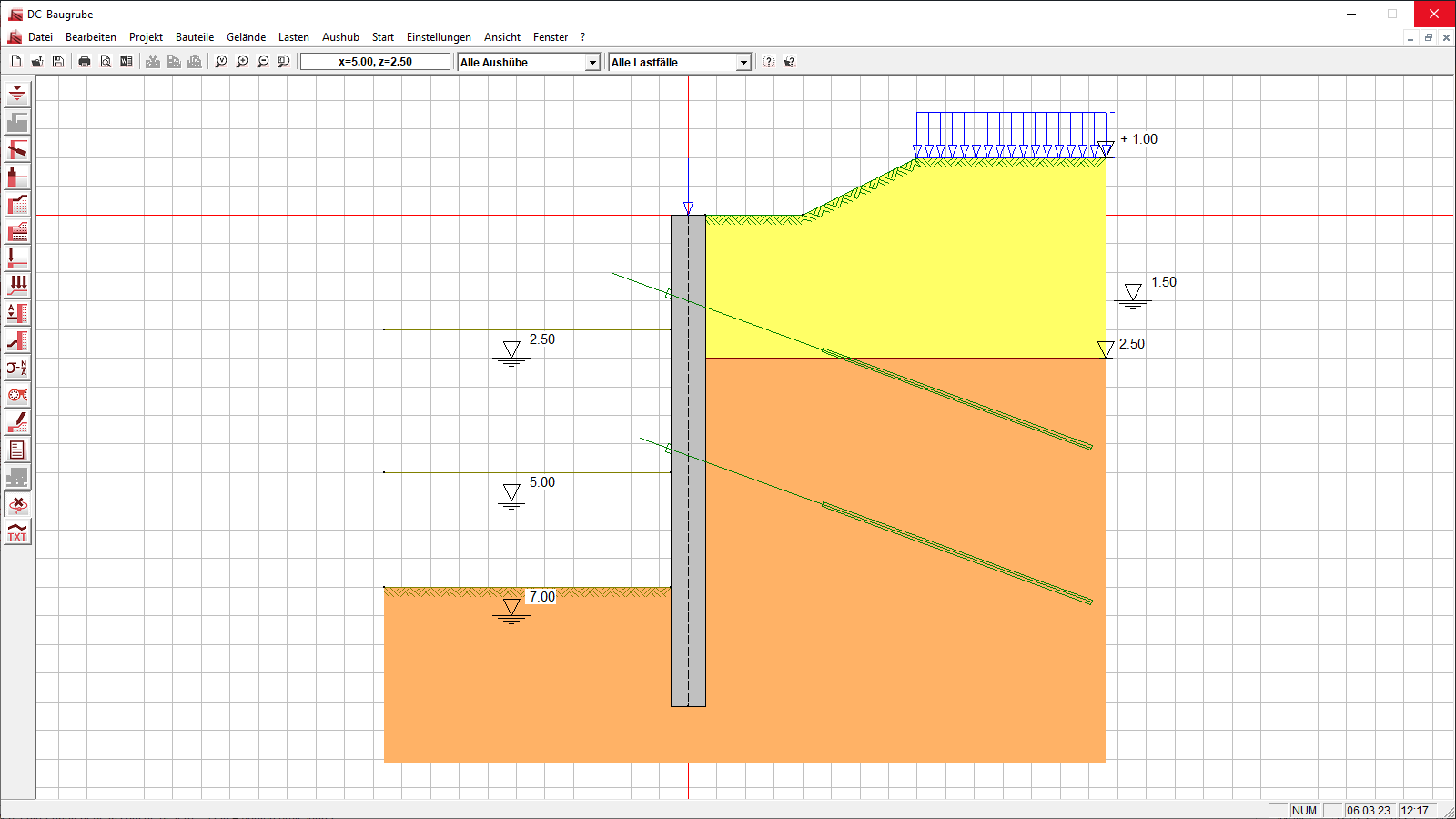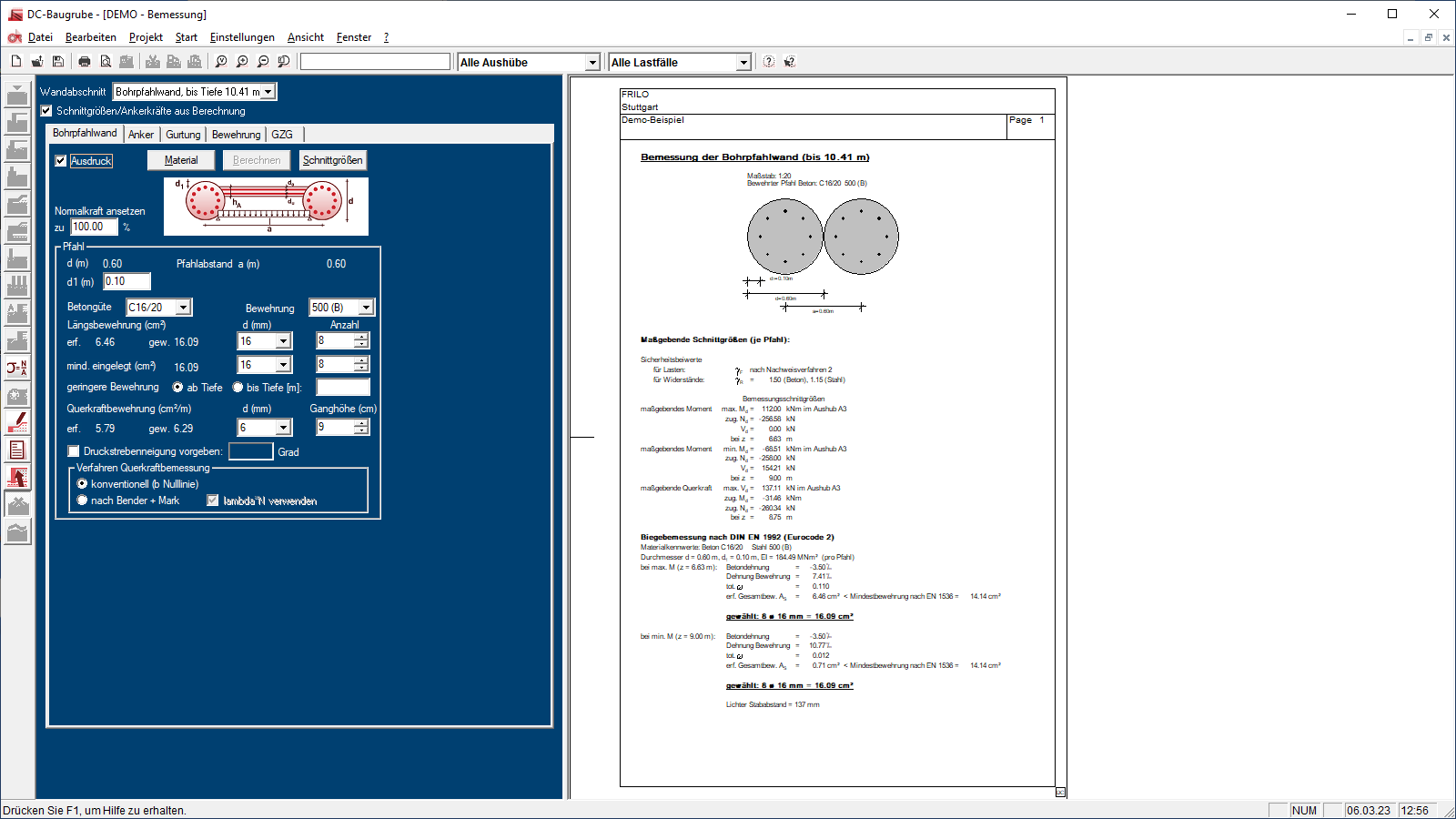 Mit dem Modul „Baugrubenwand“ lassen sich Baugruben in 2D und 3D modellieren. Ankerlagen und Gurtungen an den Verbauwänden können ebenso dargestellt werden wie alle relevanten Sparten in der nahen Umgebung der Baugrube. Außerdem können Anwender die modellierten Baugrubenwände vom Typ Bohrpfahlwand, Schlitzwand, Spundwand, Trägerbohlwand und Mixed In Place (MIP) umfassend berechnen, bemessen und bewehren.