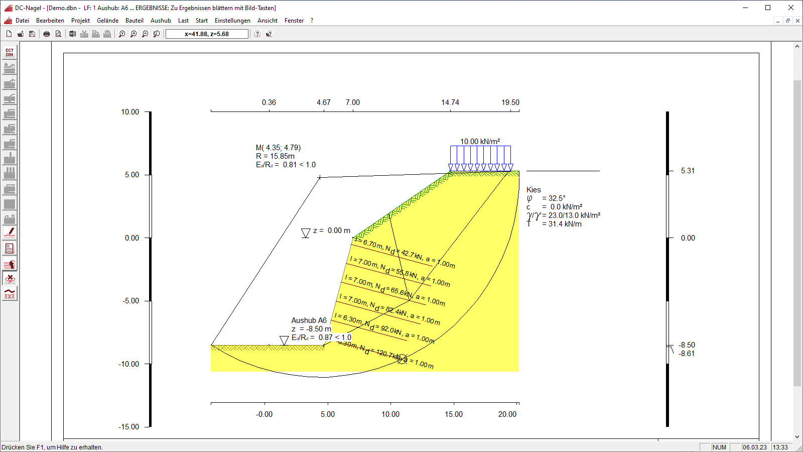 • Nachweis der Nägel: Ermittlung der Nagelkräfte, Stahlspannung, Übertragung der Nagelkräfte in den Boden, Berechnung der Nagellängen und Nageldurchmesser