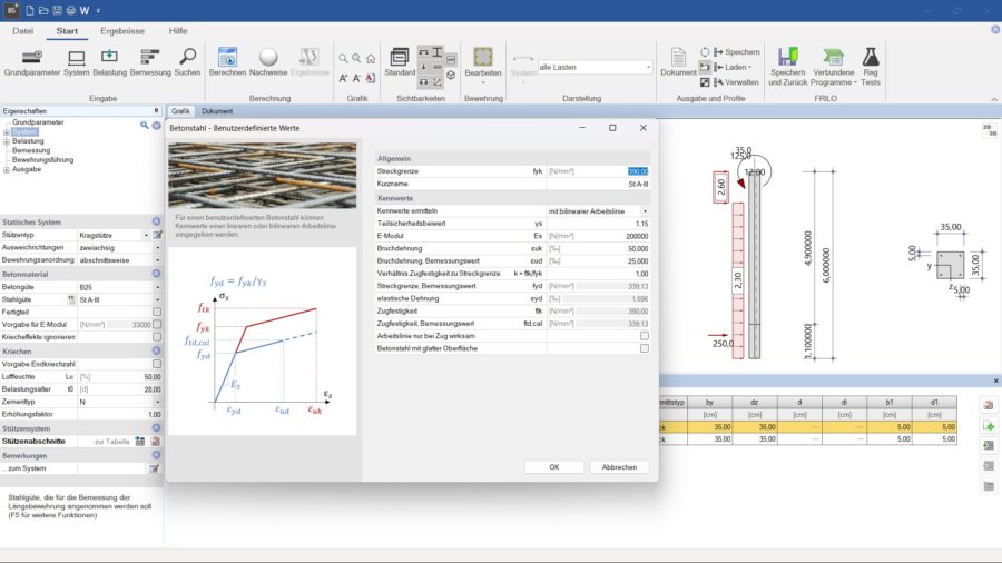 Mit der Version 2025-2 lassen sich für Stützen, Durchlaufträger, Treppenläufe, Auflager- und Stahlbetonkonsolen benutzerdefinierte Betone und Bewehrungsstähle eingeben und bei der statischen Berechnung in Betracht ziehen. So können z.B. auch historische Baustoffe, die häufig geringere Festigkeiten als die heutigen Eurocode-Materialien aufweisen, bei der Bemessung nach Eurocode berücksichtigt werden. Zudem lassen sich bei Bedarf die Teilsicherheitsbeiwerte auf der Materialseite anpassen. Wurde ein benutzerdefiniertes Material einmal angelegt, kann es abgespeichert und in den anderen unterstützenden Programmen unterschiedlicher Projekte verwendet werden.