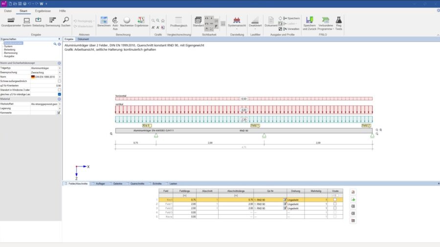 Mit FRILO 2025-2 steht Anwendern nun die Bemessung von Aluminiumträgern zur Verfügung. Die Bemessung erfolgt auf Grundlage der DIN EN 1999. Es lassen sich Einfeld- und Mehrfeldträger mit unbegrenzter Feldanzahl mit oder ohne Kragarme berechnen. Querschnitte können konstant oder veränderlich sein. Gelenke sind ebenfalls möglich. Zusätzlich ist die Bemessung für zweiachsige Beanspruchung auch für Aluminiumträger verfügbar.