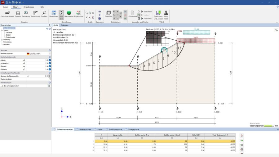 Anwender können nun die Teilsicherheitsbeiwerte für die Einwirkungen und die geotechnischen Kenngrößen beim zugrundeliegenden Nachweisverfahren für den Böschungsbruch beliebig anpassen. Für die Berechnung des Böschungsbruch lässt sich auch die alte DIN 1054:1976 auswählen. Um das Verschieben von Geländepolygonen nur in horizontaler oder vertikaler Richtung zu fixieren, wurden zusätzliche Schaltflächen ergänzt.