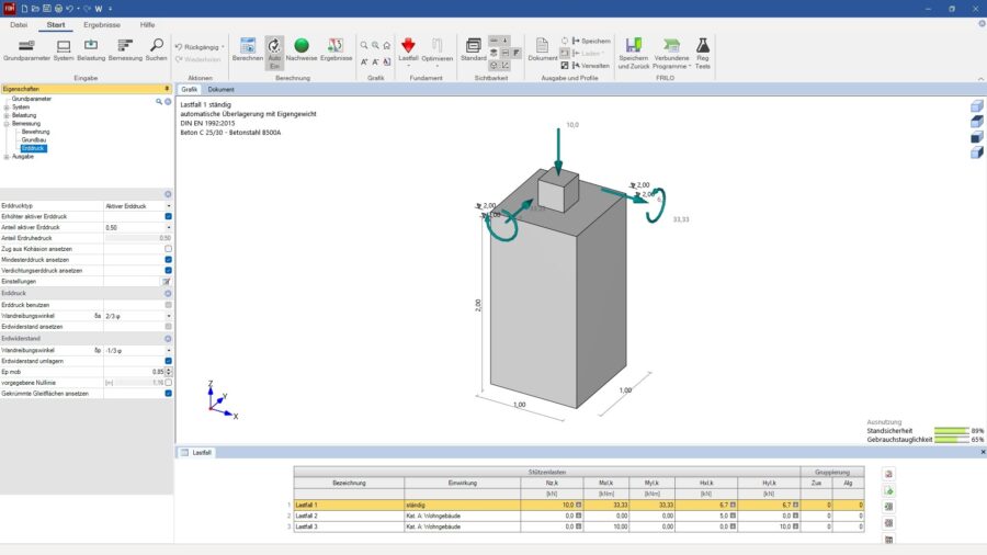 Anwendern stehen bei der Bemessung von Mastfundamenten mit FRILO 2025 nun auch umfangreiche Erddruckdefinitionen zur Verfügung. Es lassen sich aktiver Erddruck, beliebig erhöht aktiver Erddruck, Erdruhedruck, Verdichtungserddruck und Erdwiderstand ansetzen. Das Ansetzen des maßgebenden Erddrucks auf der aktiven und passiven Seite wird gemäß den resultierenden Lasten automatisch gewählt. Gegebenenfalls wird das Fundament entlang aller Fundamentkanten separat ausgewertet, um die höchste Auslastung zu ermitteln.